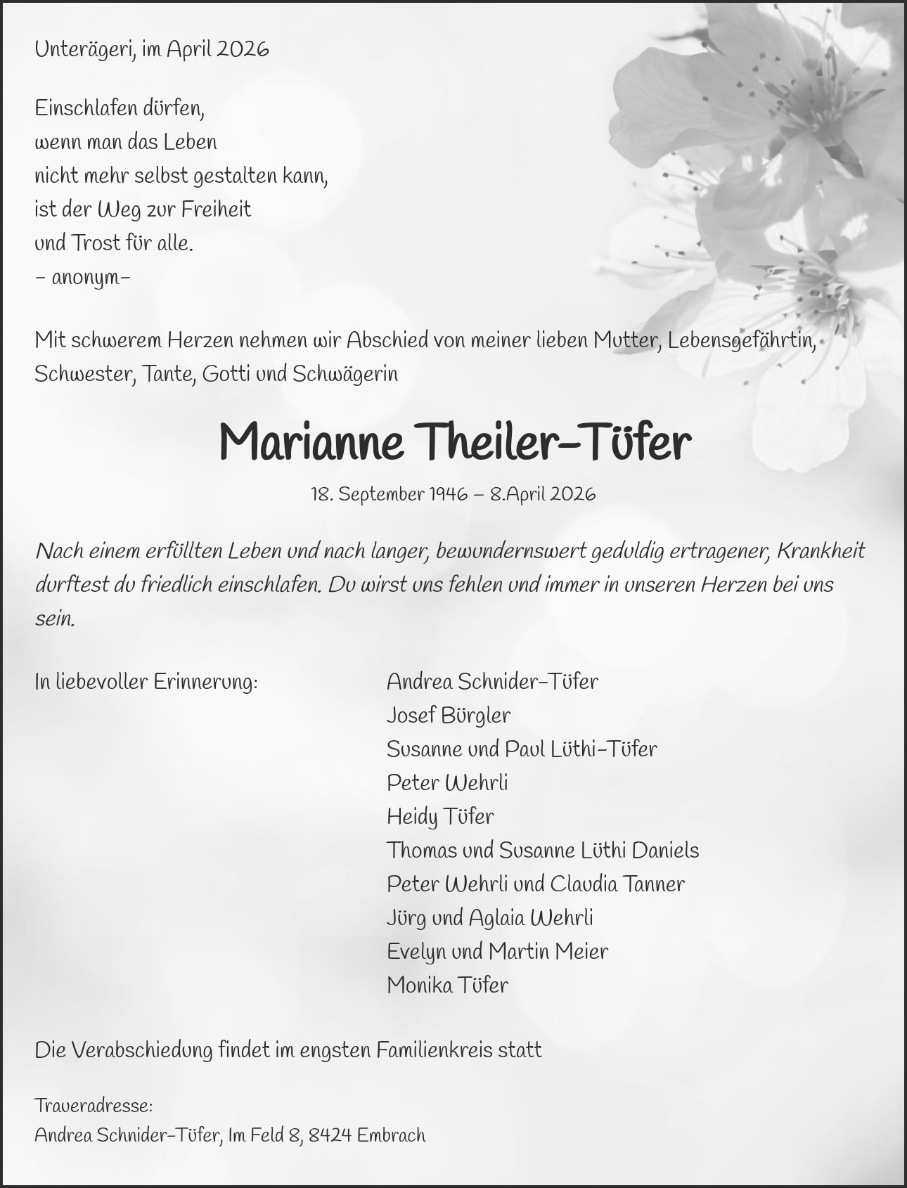 Traueradresse: Andrea Schnider-Tüfer, Im Feld 8, 8424 Embrach